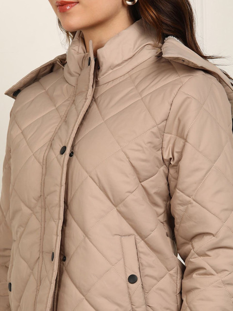 Beige solid lightweight quilted jacket with faux fur trim, has a hooded, 2 pockets ,has a snap button closure, long sleeves, straight hemline, faux fur lining