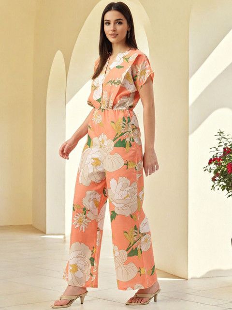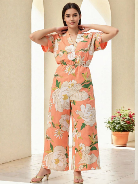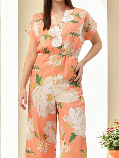 Peach-coloured and white printed basic jumpsuit ,has a v-neck, sleeveless, na pockets