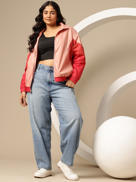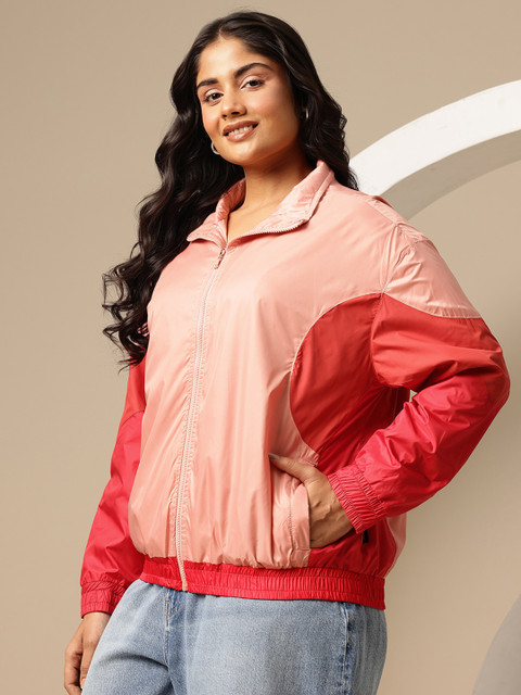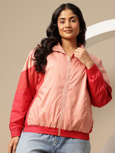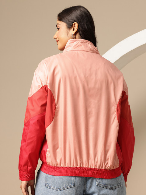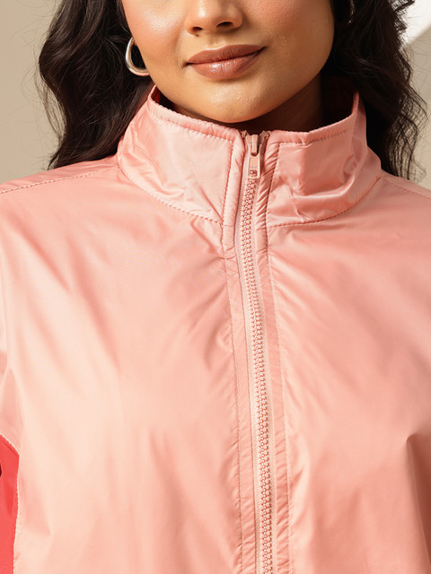 Peach-coloured and red colourblocked bomber, has a mock collar, 3 pockets ,has a zip closure, long sleeves, straight hemline, polyester lining