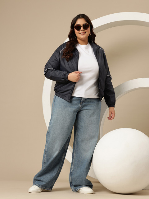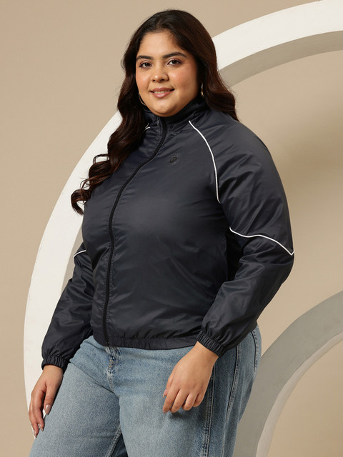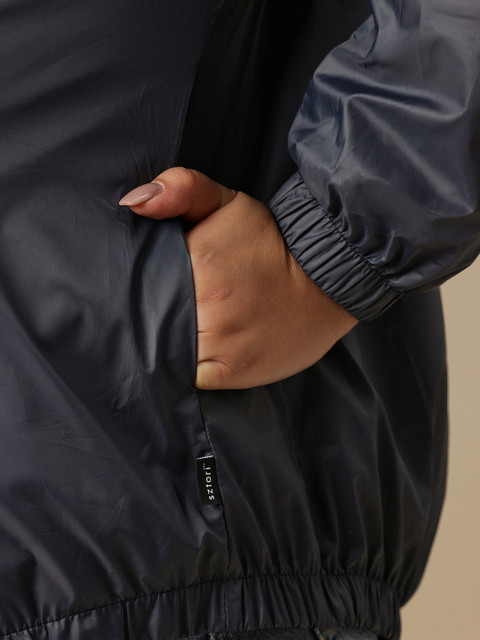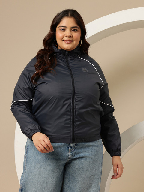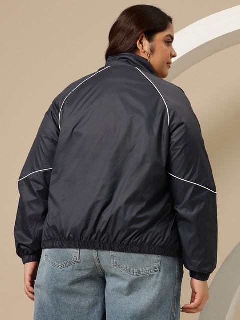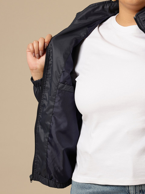 Navy blue solid bomber jacket, has a mock collar, 2 pockets, zip closure, long sleeves, straight hemline, polyester lining with inner pocket