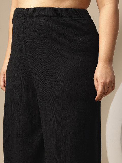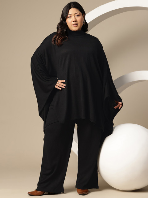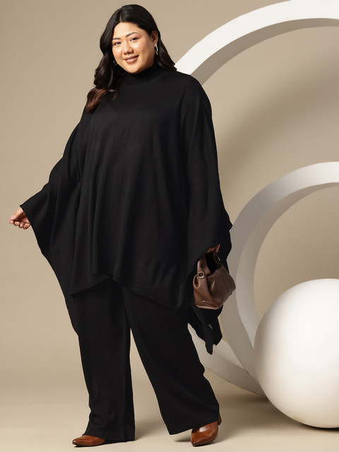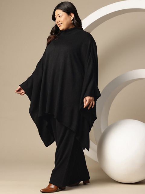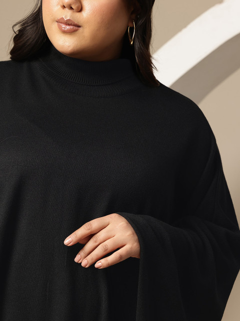 Black solid poncho, has high-neck,long sleeves, asymmetric hem