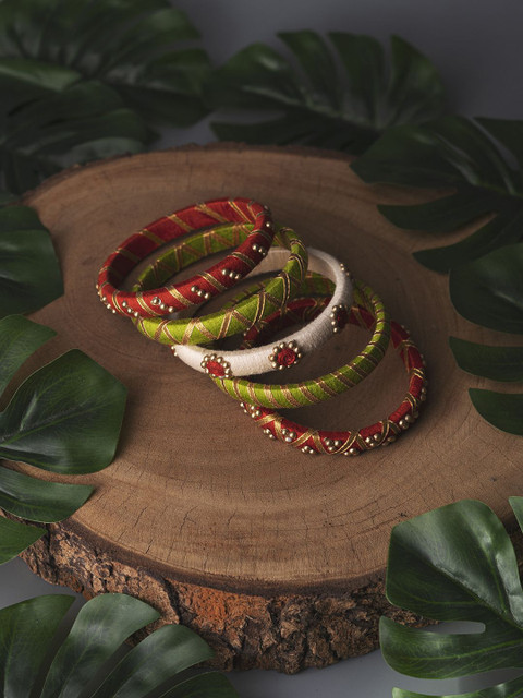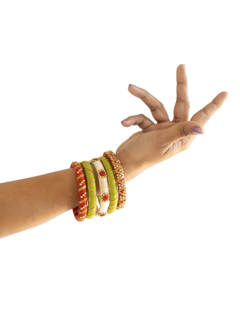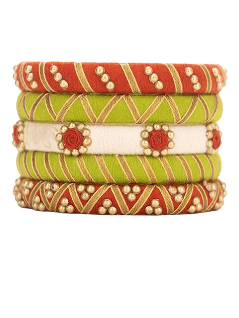 Set of 5 green bangles, each has beaded details, secured with slip-on closure