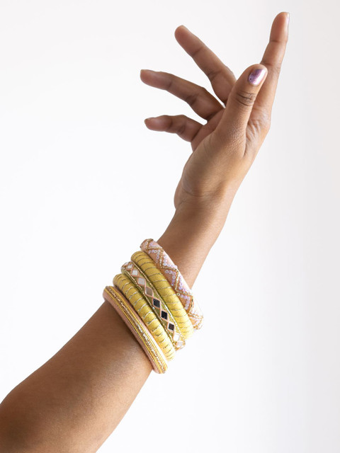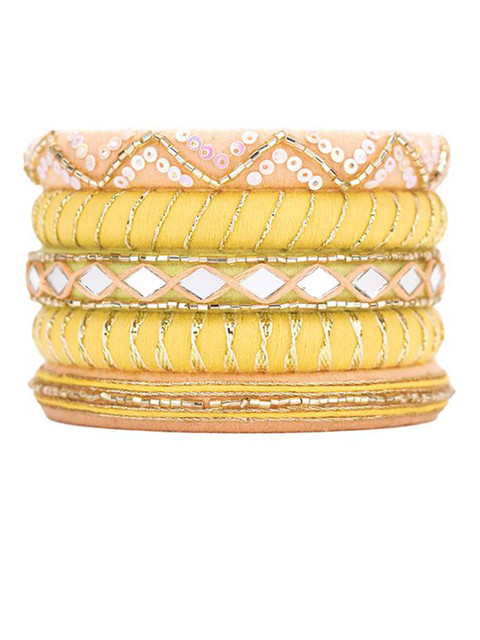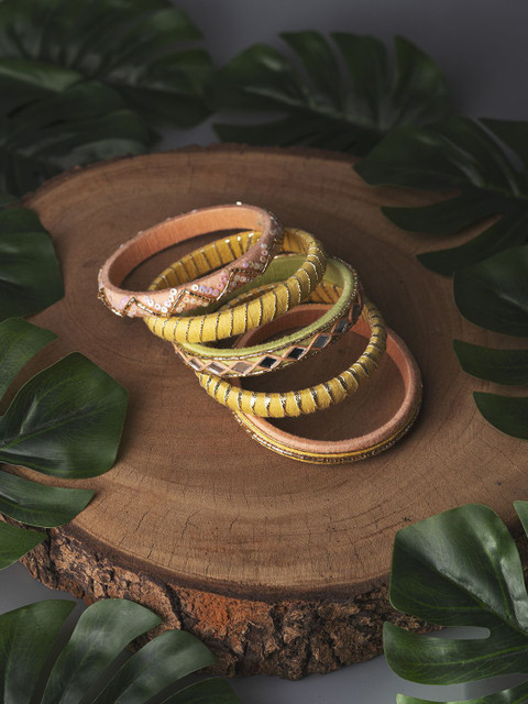 Set of 5 yellow bangles, each has stone-studded & beaded details, secured with slip-on closure
