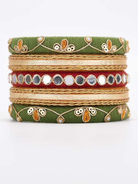 Set of 5 green & gold bangles, each has threads details, secured with slip-on closure