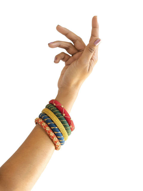 Set of 5 red & green bangles, each has threads details, secured with slip-on closure