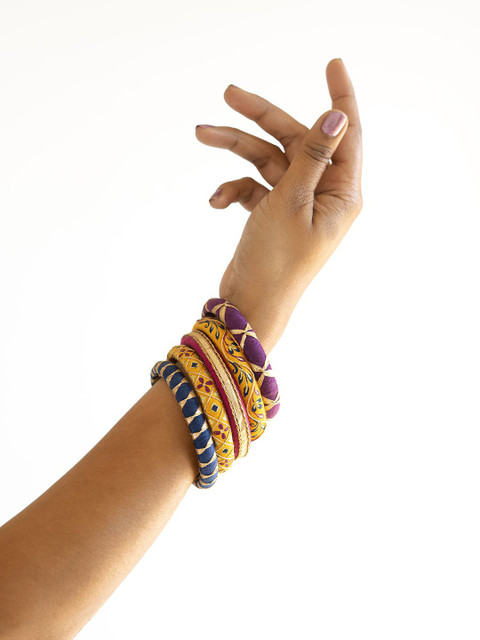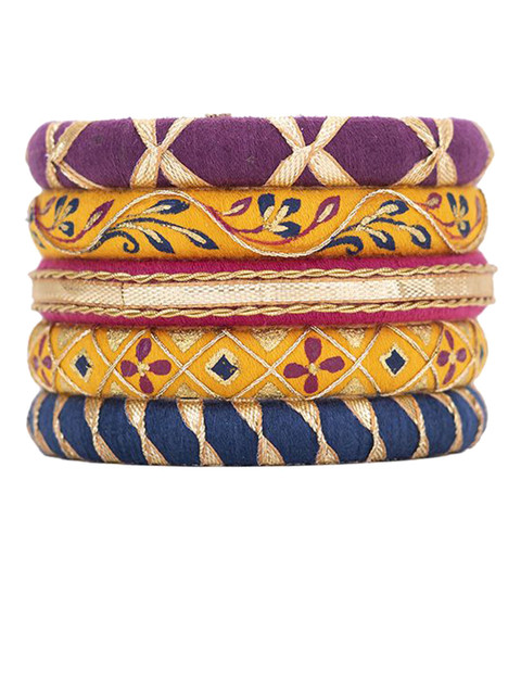 Set of 5 yellow & purple bangles, each has threads details, secured with slip-on closure