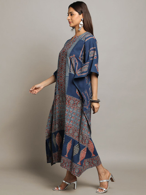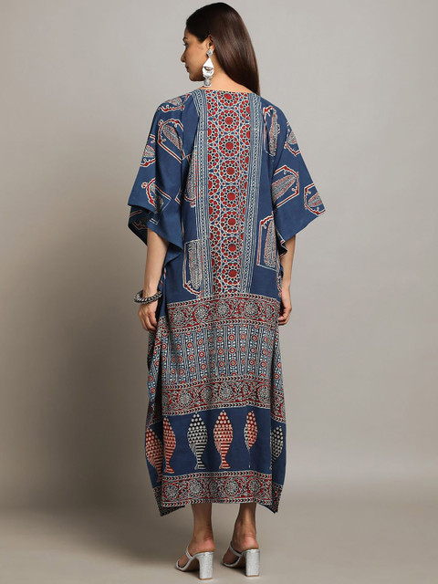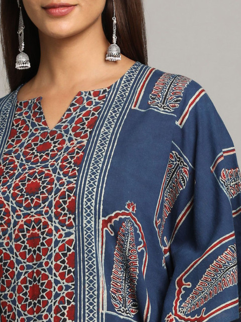 Ajrakh, a traditional craft with deep roots in India, particularly in the regions of Gujarat and Rajasthan, has been practiced for centuries. The process involves several stages of dyeing and resist printing, using natural dyes like indigo, madder, and black, along with mordants to set the colors. Ajrakh designs are renowned for their symmetry and rich, jewel-like hues. Historically, it has been an important craft for creating textiles for royalty and rituals, and continues to be a symbol of heritage, showcasing the skill and artistry passed down through generations.