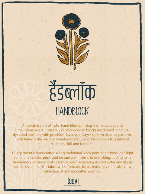 Craft Disclaimer: This garment is handcrafted using traditional block printing techniques. Slight variations in color, print, and texture are intrinsic to its making, adding to its uniqueness. To preserve its essence, wash separately in cold water and dry in shade. Over time, the fabric will soften, and its patterns may shift subtly–a reflection of its handcrafted journey.