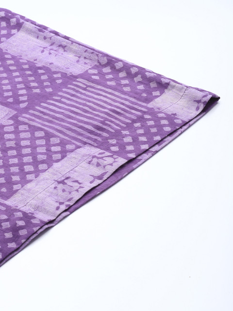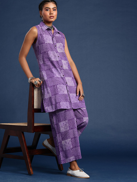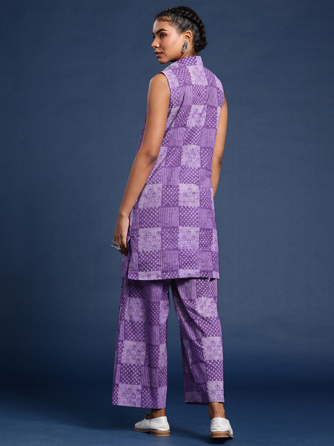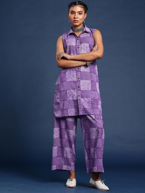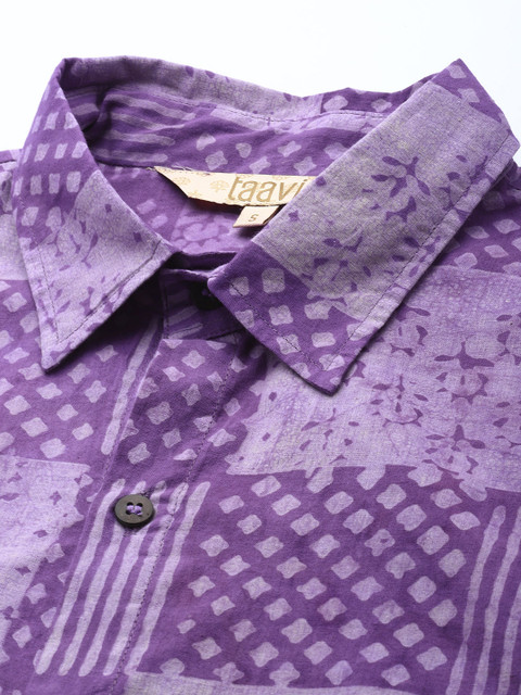 - Purple ethnic motifs block printed Tunic, has a shirt collar, has sleeveless, has button closure