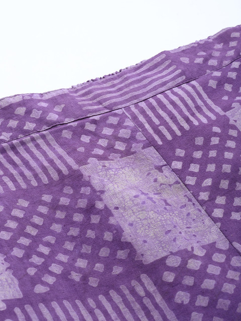 - Purple ethnic motifs block printed Trousers, has 2 pockets and a partially elasticated waistband with a slip-on closure