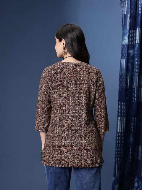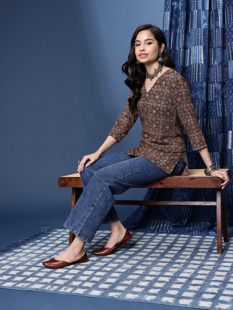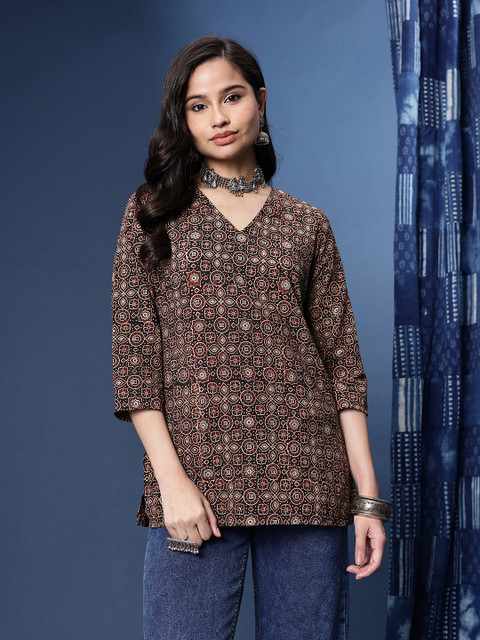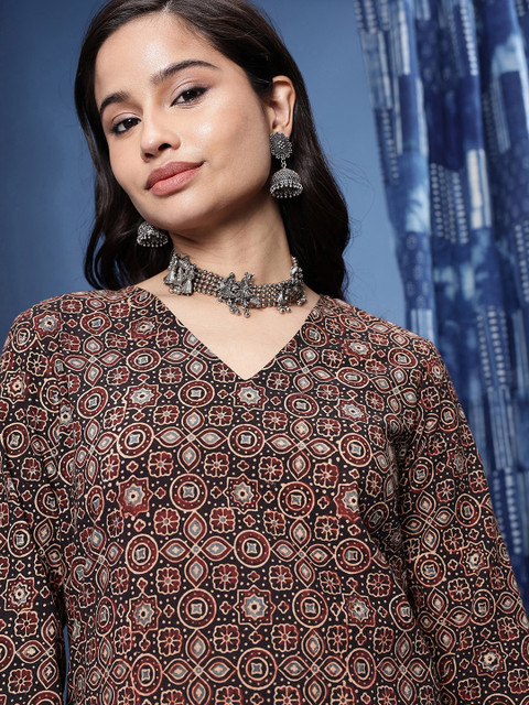 Ajrakh: Ajrakh textiles have travelled from early Sindh finding its roots in Kutch, Gujarat. It is a sustainable technique of combining resist dyeing with the block prints and other dyeing practices. The word literally translates to “aaj rakh” which means to keep in dyeing for an entire day. Processing an Ajrakh takes as much as 13 stages. The longer the wait between each process, finer is the result