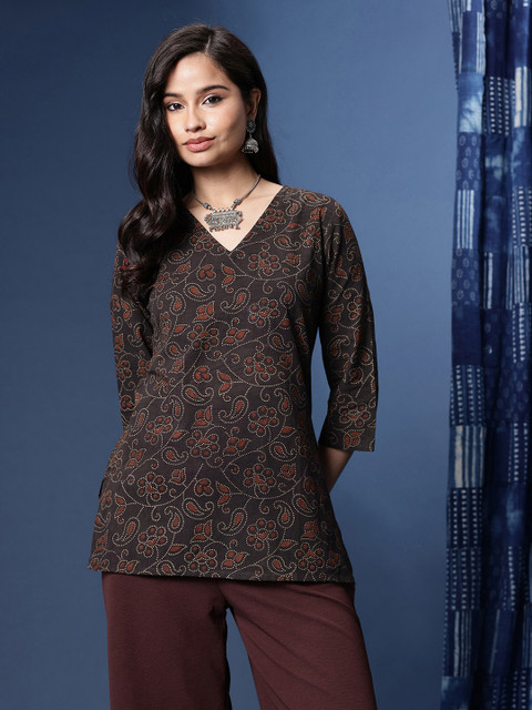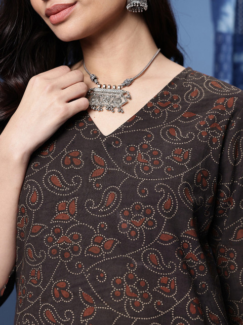 Ajrakh: Ajrakh textiles have travelled from early Sindh finding its roots in Kutch, Gujarat. It is a sustainable technique of combining resist dyeing with the block prints and other dyeing practices. The word literally translates to “aaj rakh” which means to keep in dyeing for an entire day. Processing an Ajrakh takes as much as 13 stages. The longer the wait between each process, finer is the result