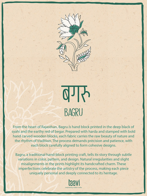 Craft Discription: From the heart of Rajasthan, Bagru is hand block printed in the deep black of syahi and the earthy red of begar. Prepared with harda and stamped with bold hand carved wooden blocks, each fabric carries the raw beauty of nature and the rhythm of tradition.