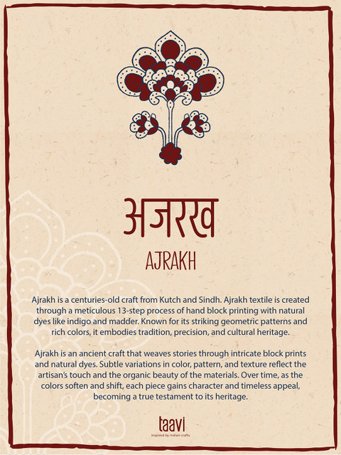 Ajrakh is a centuries-old craft from Kutch and Sindh. Ajrakh textile is created through a meticulous 13-step process of hand block printing with natural dyes like indigo and madder. Known for its striking geometric patterns and rich colors, it embodies tradition, precision, and cultural heritage.