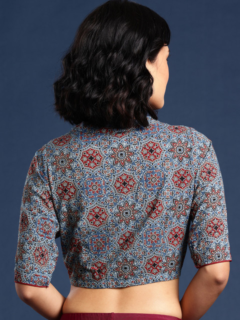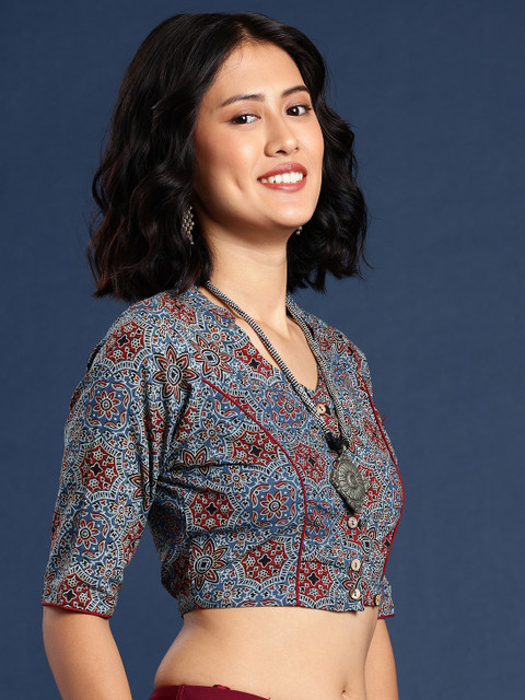 Blue hand blockprinted non-padded saree blouse, has a v-neck, short sleeves and a front button closureCraft Disclaimer: