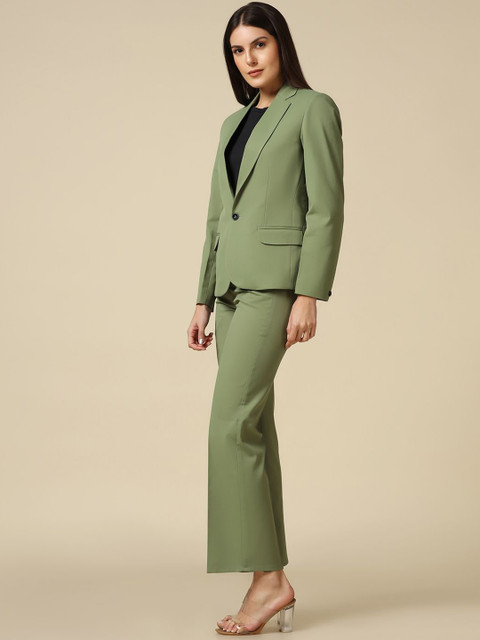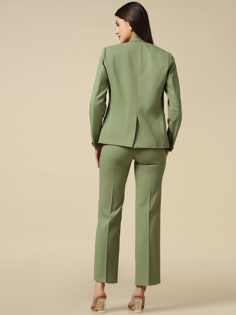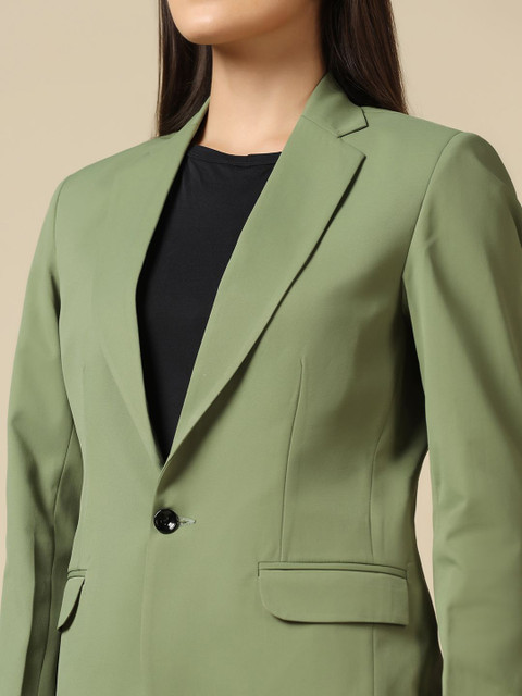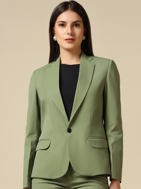 Olive green solid regular-fit blazer, has a notched lapel, single-breasted with double button closures, long sleeves, one welt pocket, and two flap pockets, and a double-vented back hem