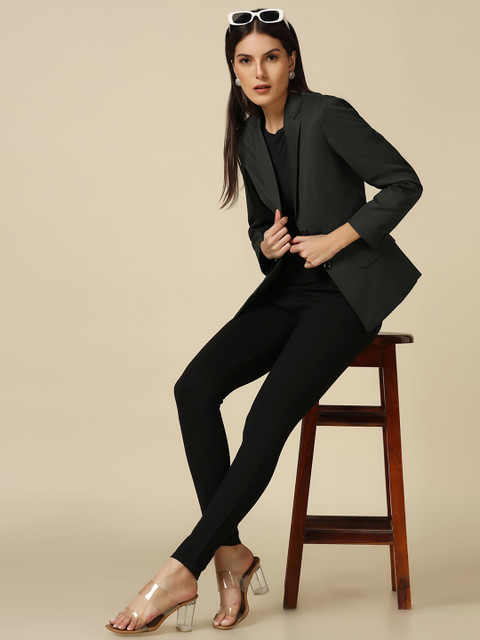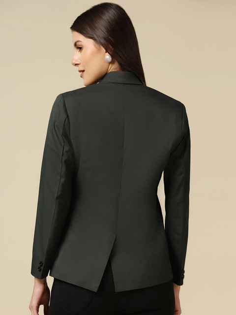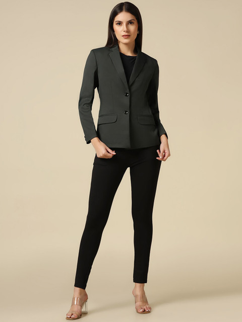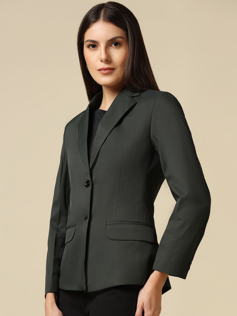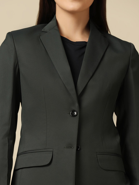 Green solid slim-fit formal blazer, has a notched lapel, long sleeves, single-breasted with double button closure and two pockets and ventless hem