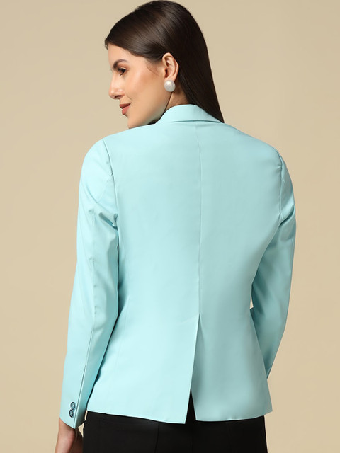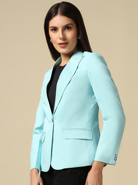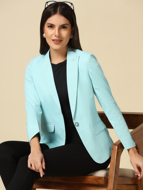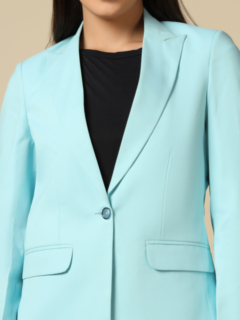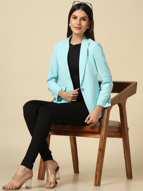 Blue solid slim-fit semiformal blazer, has a notched lapel, long sleeves, single-breasted with double button closure and two pockets and ventless hem