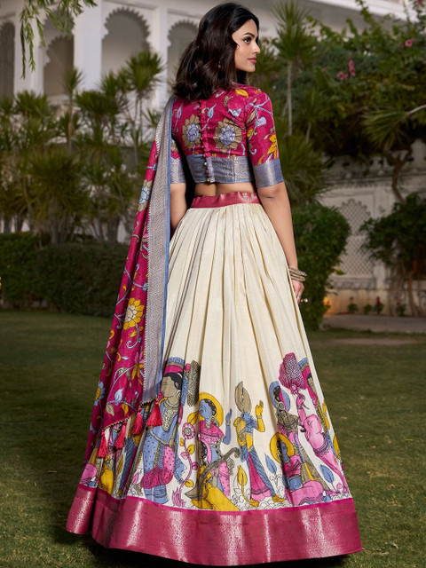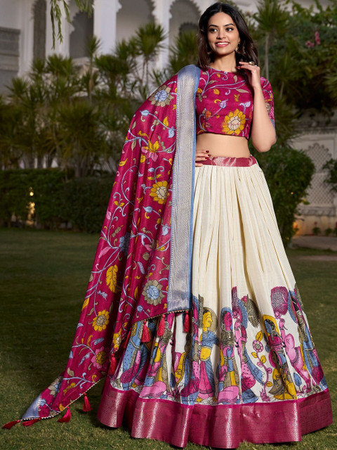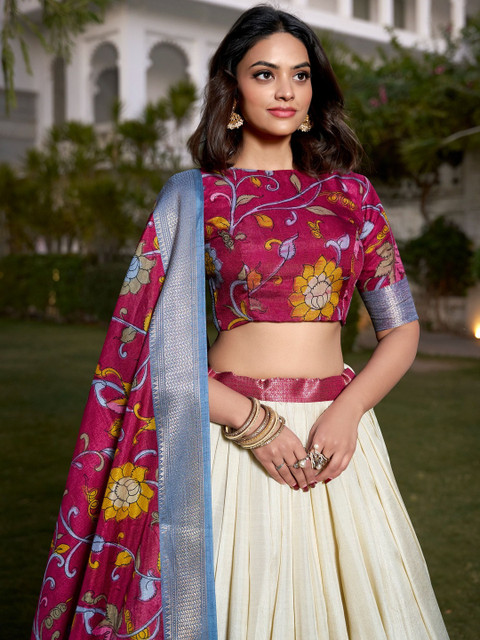 Lehenga (Stitched):Fabric: Tusser Silk with Jacquard BorderWork: Floral Print with Foil WorkWaist: Up to 44 inchesLength: 41 inchesFlair: 3 MeterInner: Micro CottonClosure: Zip with Canvas BeltBlouse (Unstitched):Fabric: Tusser Silk with Jacquard BorderWork: Floral Print with Foil WorkLength: 0.80 MeterDupatta:Fabric: Tusser Silk with Jacquard BorderWork: Floral Print with Foil WorkBorder: Gotta Patti Lace with TasselsLength: 2.4 Meter