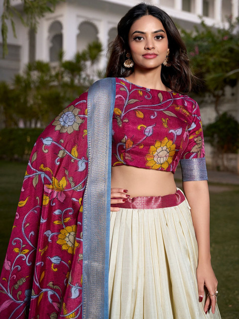 White Printed Unstitched blouse, Three-Quarter Sleeves, White and Printed Ready to Wear lehenga, has Slip-On closure, White Printed dupatta, Printed border