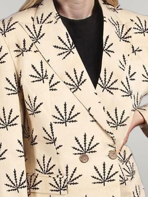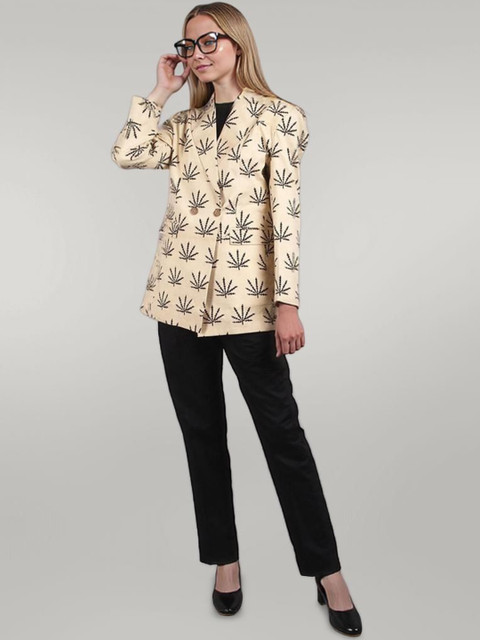 Beige and black printed regular-fit casual blazer, has a notched lapel, long sleeves, double-breasted with double button closure, two flap pockets and a single vent back hem