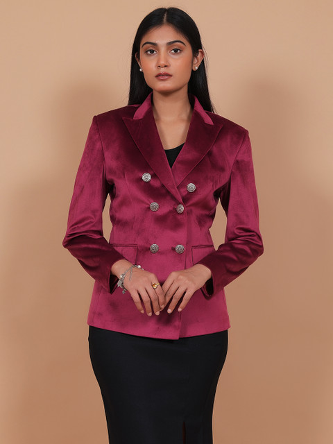 Red solid Regular-fit Casual blazer, has a notched lapel, long sleeves, Double-breasted with double button closure, two flap pockets, one welt pocket and a single-vented back hem