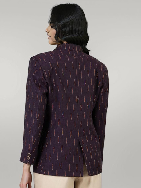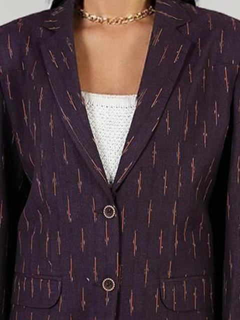 Brown ikat printed regular-fit casual blazer, has a notched lapel, long sleeves, single-breasted with double button closure, two flap pockets, and a single-vented back hem