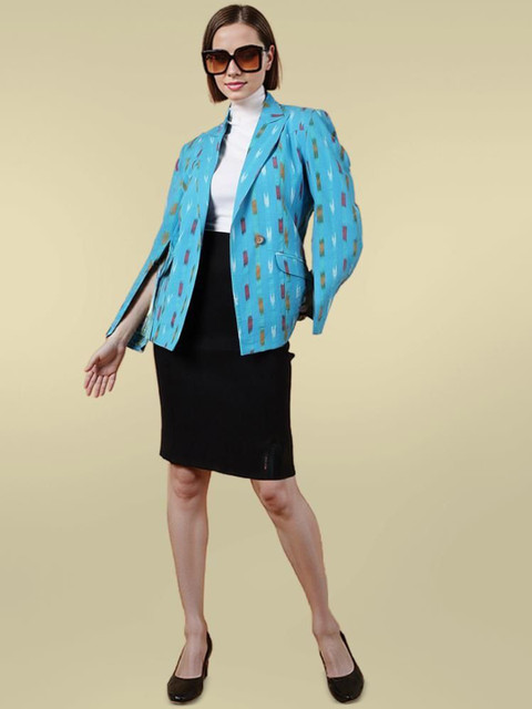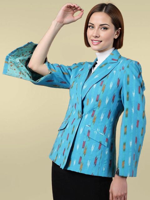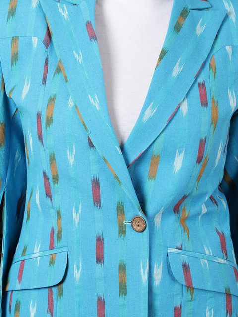 Blue ikat printed regular-fit casual blazer, has a notched lapel, long sleeves, single-breasted with double button closure, two flap pockets and a single vent back hem