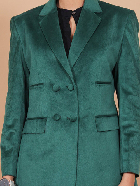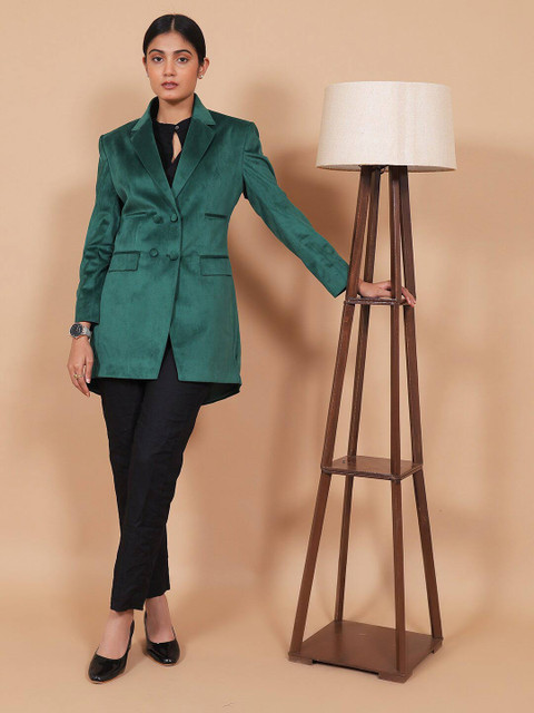 Green solid regular-fit casual blazer, has a notched lapel collar, long sleeves, double-breasted with double button closure, two flap pockets, one welt pocket and a single-vented back hem