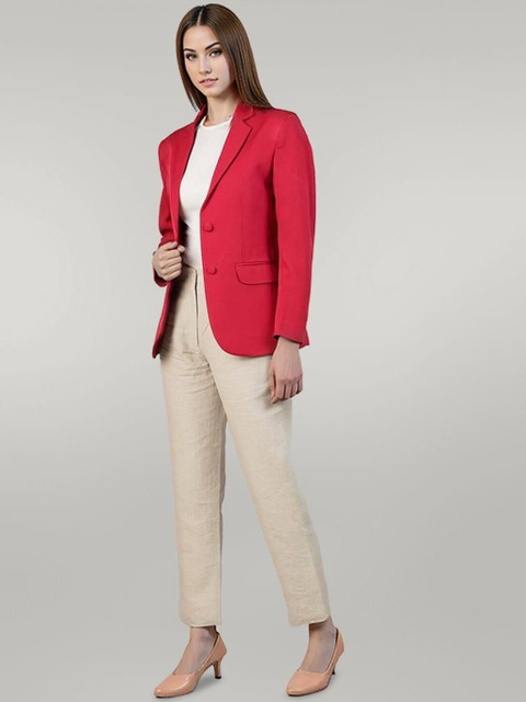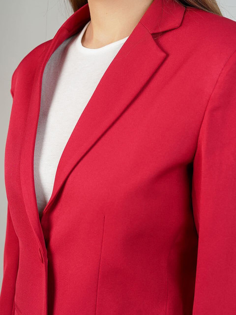 Red solid regular-fit casual blazer, has a notched lapel, long sleeves, single-breasted with double button closure, two flap pockets, and a single-vented back hem