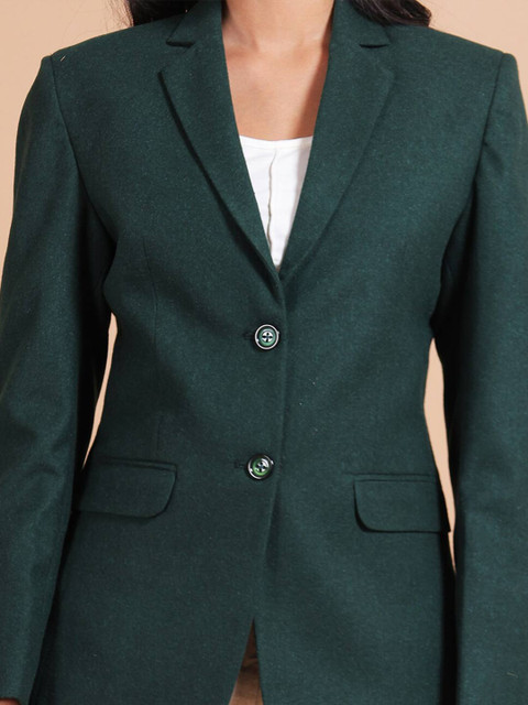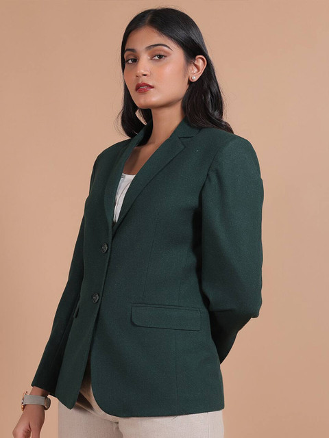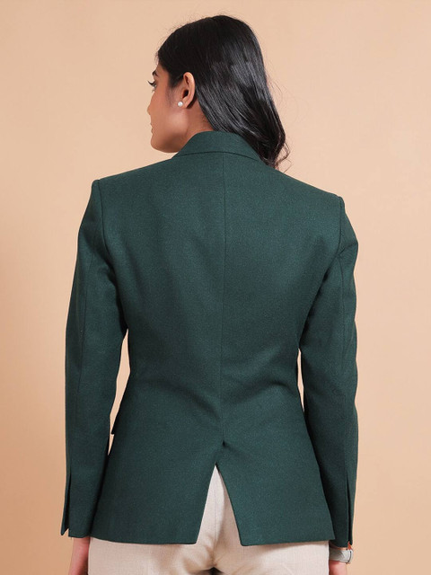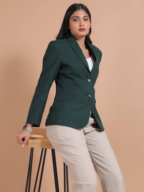 Green solid regular-fit casual blazer, has a notched lapel collar, long sleeves, single-breasted with double button closure, two flap pockets & single-vented back hem