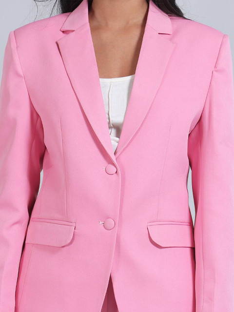 Pink solid regular-fit casual blazer, has a notched lapel, long sleeves, single-breasted with double button closure, two flap pockets, one welt pocket and a single-vented back hem