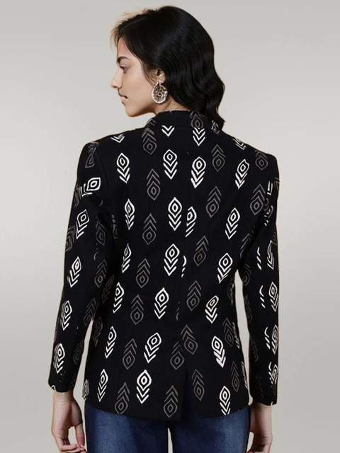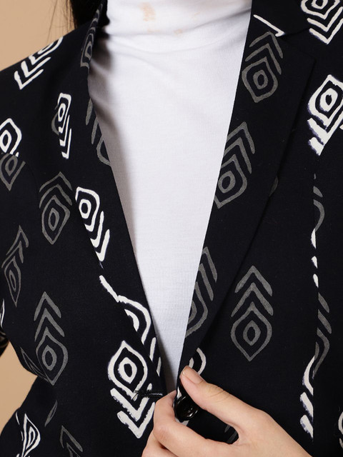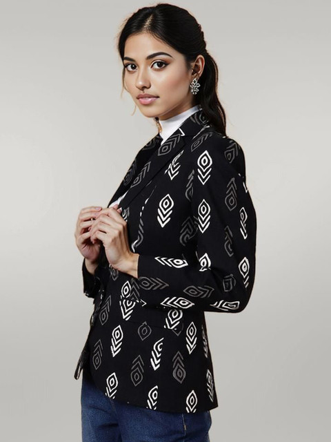 Black and white printed regular-fit casual blazer, has a notched lapel, long sleeves, single-breasted with double button closure, two flap pockets and a single vent back hem