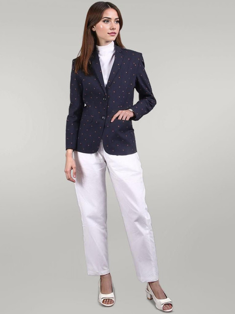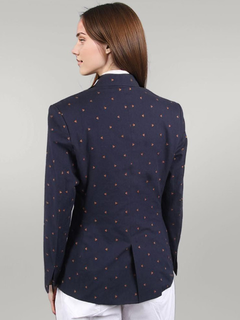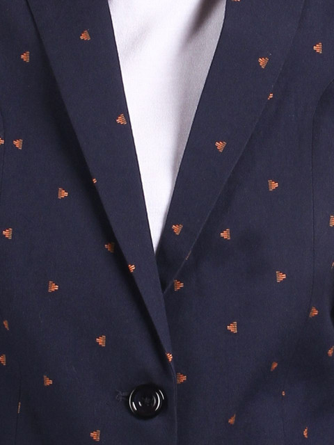 Blue printed regular-fit casual blazer, has a notched lapel, long sleeves, single-breasted with double button closure, two flap pockets and a single vent back hem