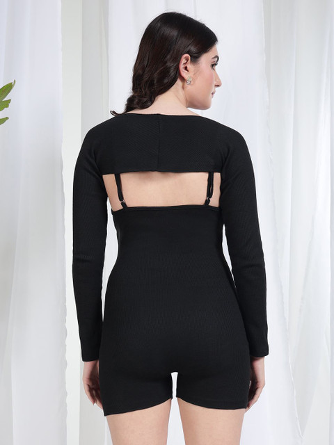 Black solid playsuit ,has a shoulder straps, sleeveless, na pockets