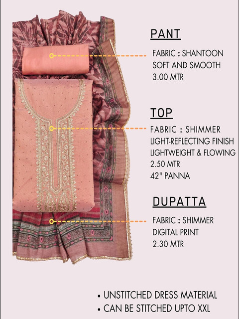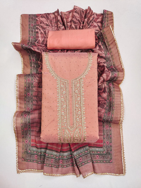 Peach-coloured, grey and gold-toned embroidered unstitched dress material