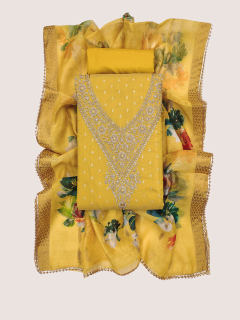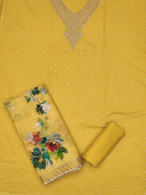 Yellow and blue embroidered unstitched dress material