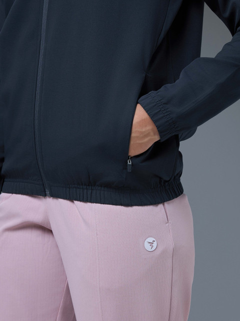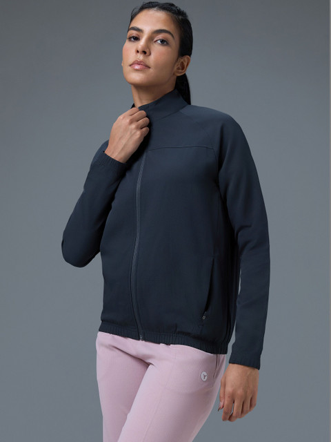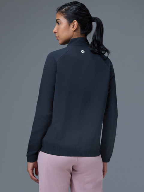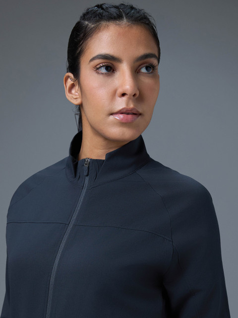 Charcoal solid lightweight sporty jacket, has a stand collar, na pockets ,has a zip closure, long sleeves, straight hemline, without lining