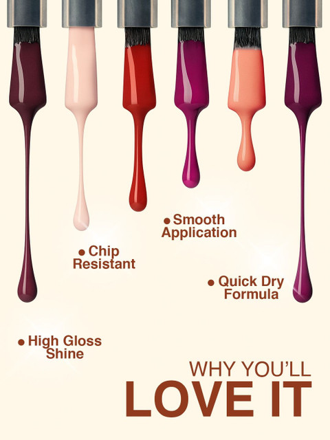 | How-to-Apply | Clean and dry your nails properly.Apply one thin, even coat of nail paint starting from the center, then sides.Allow it to dry completely.Apply a second coat for a more intense color and better finish.For Clear Nail Paint, apply over colored nail paint as a top coat for extra shine and protection. |
