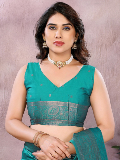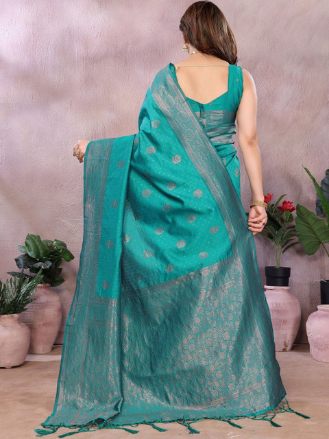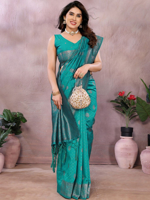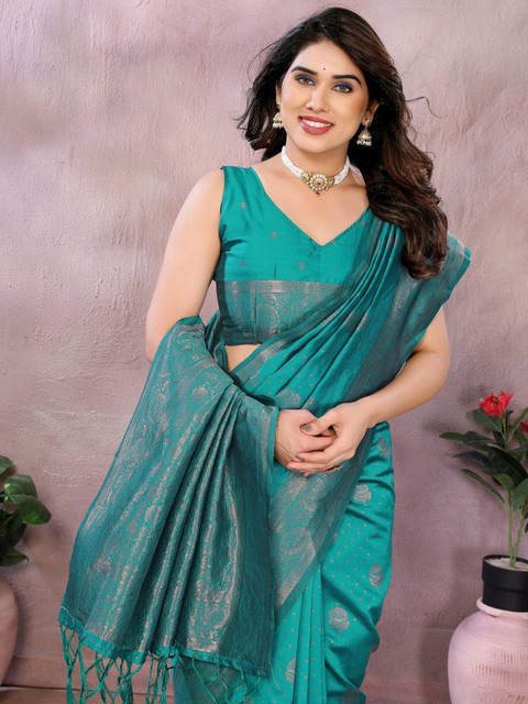 - Green and gold-toned kanjeevaram saree
