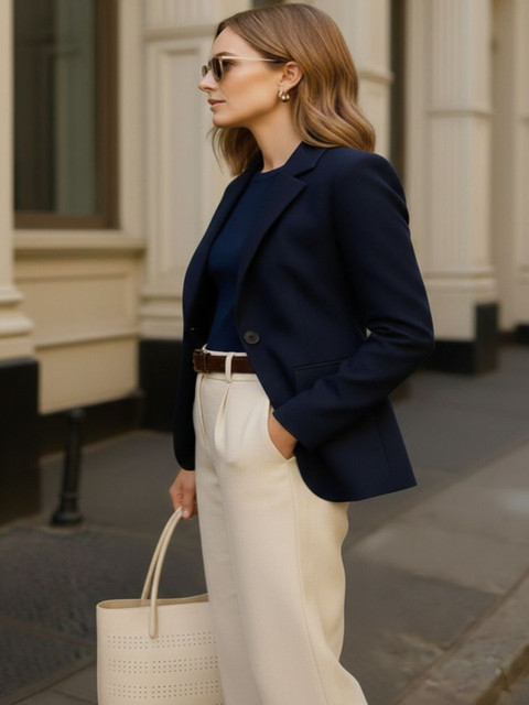 THE FASHION HUB Cotton Notched Lapel Collar Single Breasted Blazer