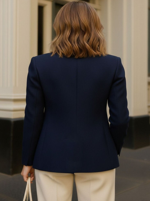 Navy blue solid regular-fit single-breasted blazer, has a notched lapel collar, long sleeves, with single button closure, two flap pockets and a ventless back hem