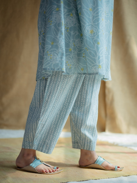 Blue printed loose fit salwar has a waistband with drawstring closure