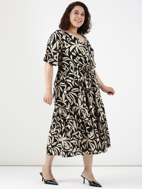 Beige Leaf Printed Dress With V neckline, Bell Sleeves And a Waist Tie