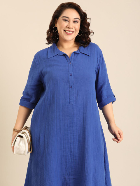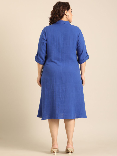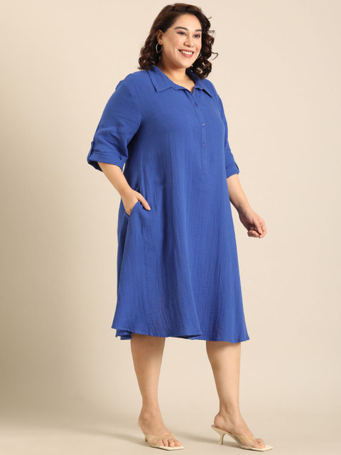 Cobalt Blue A-Line Shirt Dress With Collar Neck and 3/4th Sleeves
