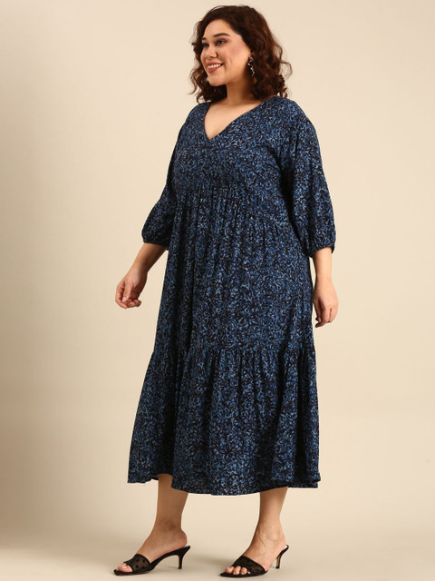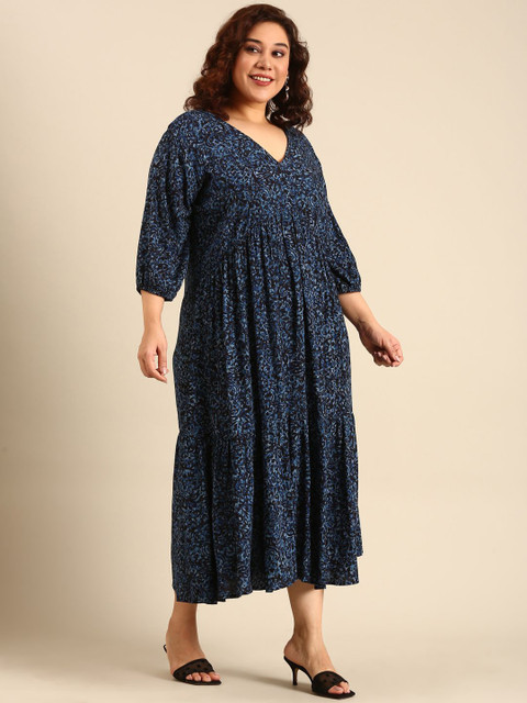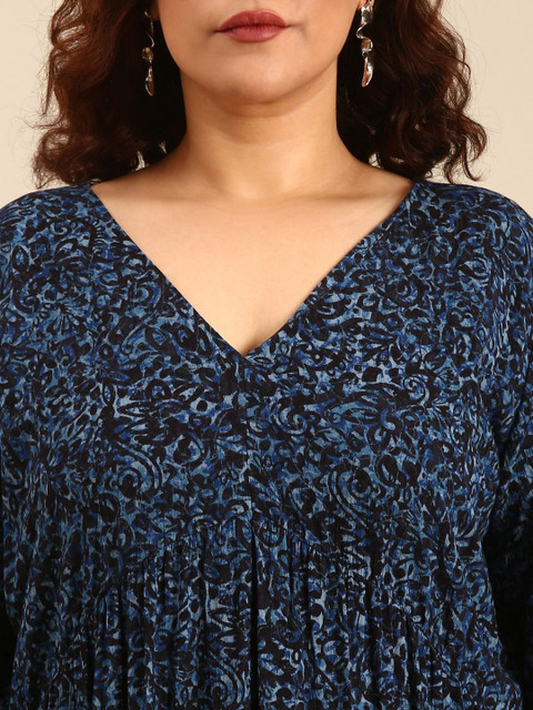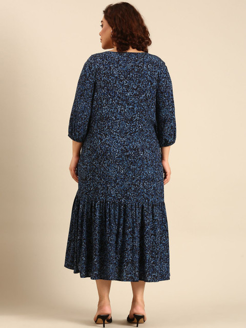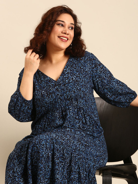 - Navy blue tropical print fit & flare dress