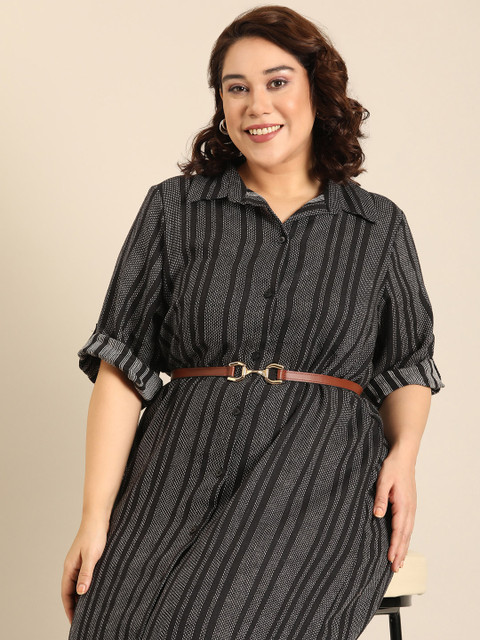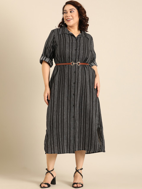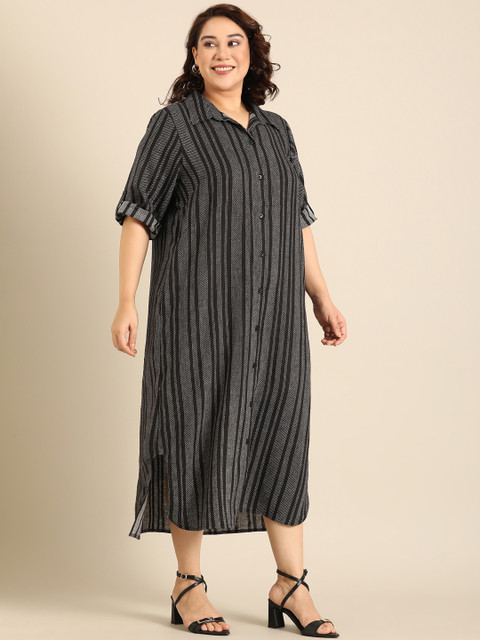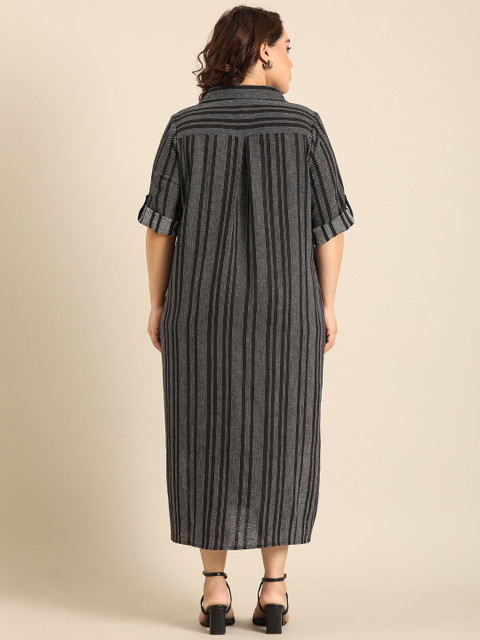 Linen Striped Maxi Shirt Dress with Three-Quarter Sleeves and Collared Neckline.