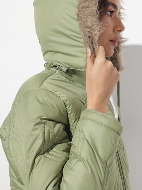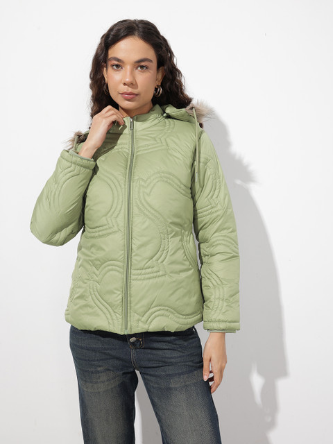 Green solid quilted jacket, has a detachable hooded, 2 pockets & 1 inner pocket, has a zip closure, long sleeves, straight hemline, polyester lining