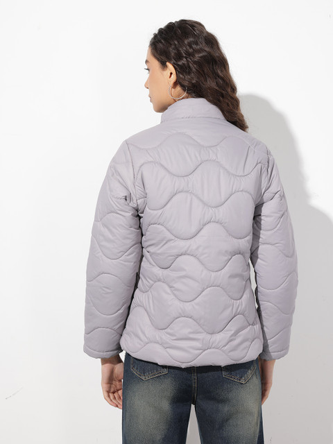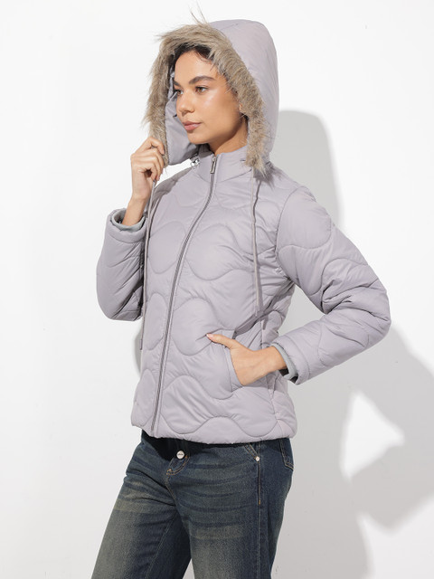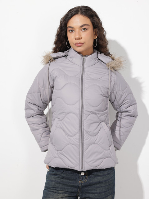 Grey solid quilted jacket, has a detachable hooded, 2 pockets & 1 inner pocket, has a zip closure, long sleeves, straight hemline, polyester lining