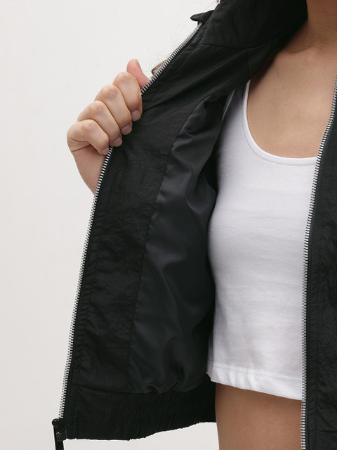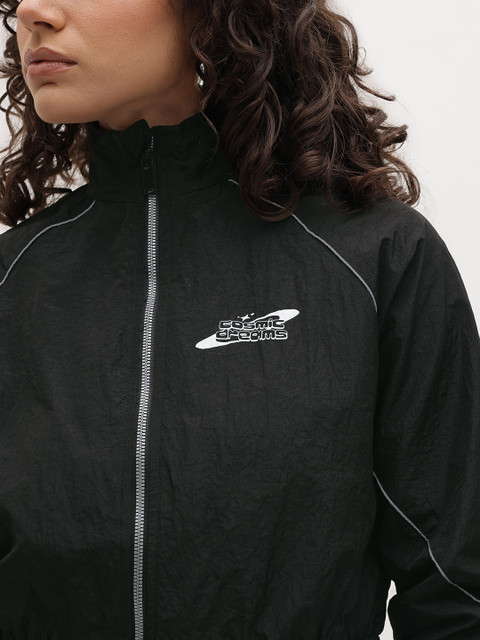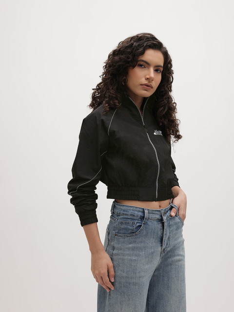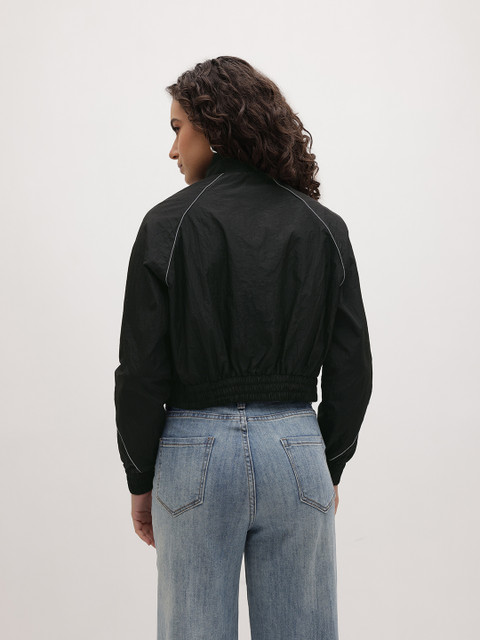 Black cropped tailored jacket, has contrast piping, has mock collar, raglan long sleeves, straight hem.